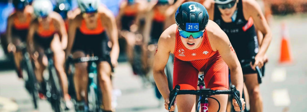 Sur le vélo, un petit groupe de 5-6 filles s’est formée et nous nous trouvions 20 secondes derrière le premier groupe. Pédalant en tête, nous avons rapidement réduit l’écart et rattrapé le premier pack lors du deuxième tour, après 10km. Un grand peloton s’est alors formé et j’ai pris la tête. Je me suis sentie très puissante sur le vélo et j’ai fourni l’effort la majeure partie des 30km restant à la tête du groupe avec l’aide de quelques unes de mes coéquipières chinoises. J’étais consciente qu’il fallait que j’essaie de m’échapper à l’avant du groupe afin de prendre de l’avance pour la course à pied. Malgré plusieurs tentatives d’attaque, il ne m’a pas été possible de partir, le parcours étant très roulant avec peu de virages techniques et un bon vent de face sur la moitié du parcours. J’ai effectué les 40km en 1:00:56. Je suis très contente de ma performance sur le vélo et de voir que je suis capable de rouler en tête.