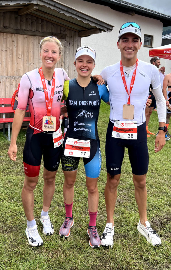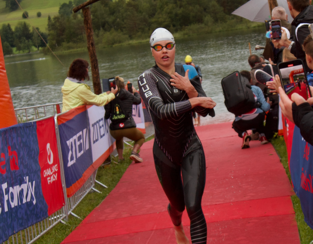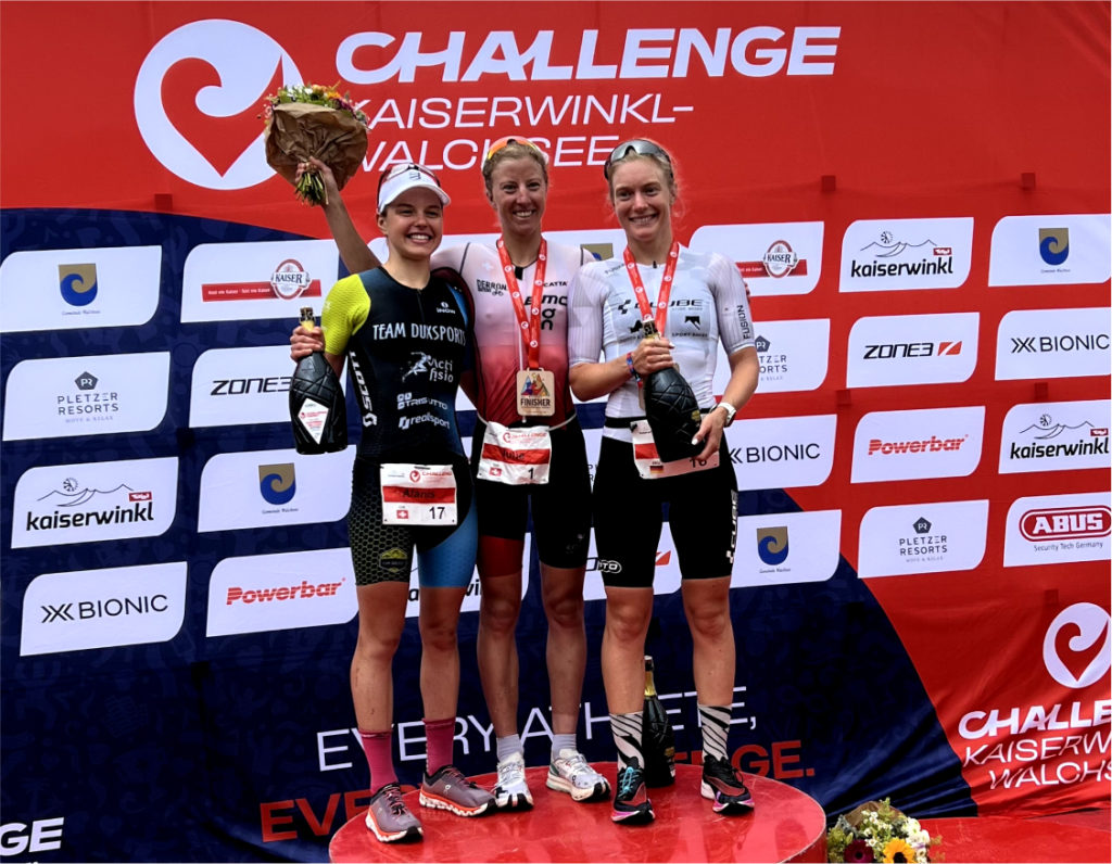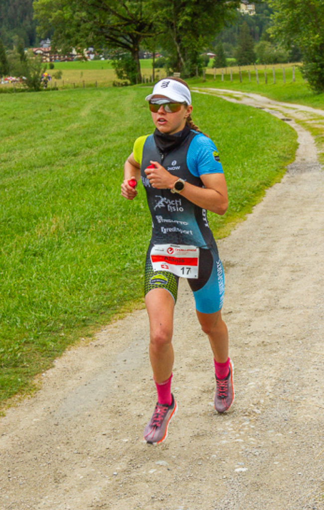 Le décor de la course était magique dans le Tyrol autrichien. Les conditions météorologiques étaient fraîches avec de la pluie le matin de la course. J’ai réalisé une bonne natation, sortant en première position de l’eau. Le parcours de vélo était plutôt technique et vallonné avec des routes mouillées. Il fallait être prudent dans les virages étroits. Je me suis sentie super à l’aise et puissante sur les deux tours du vélo. J’ai entamé la course à pied en deuxième position. J’ai adoré le parcours de course à pied avec 4 tours autour du lac. J’ai directement trouvé mon rythme et j’ai pu accélérer à chaque tour. J’ai tout donné et j’ai profité de chaque instant, je me sentais super bien et totalement dans ma bulle. J’ai réalisé mon meilleur temps sur la course à pied en 1h19min53sec pour les 21 km. J’ai franchi la ligne d’arrivée en deuxième position, une magnifique performance! C’était un immense plaisir de partager à nouveau le podium avec ma coéquipière Julie et de réitérer notre réussite 1ère-2ème place de Rapperswil. Mon résultat prouve que ma deuxième place à Rapperswil n’était pas un coup de chance, en reproduisant cet excellent effort à Walchsee, couronné par une course à pied encore plus rapide. Cela me réjouit de voir ma progression et ma régularité. Un super week-end pour mon équipe d’entrainement Trisutto avec également Panagiotis Bitados qui a remporté l’épreuve masculine.
