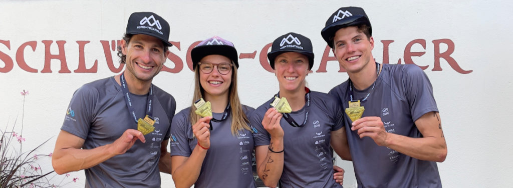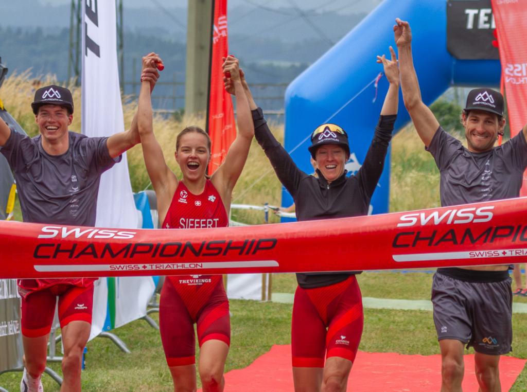 J’ai eu l’honneur de partir en dernière position et de bénéficier de la précieuse avance que mes coéquipiers avaient déjà mis. J’ai effectué les 200m de natation dans la rivière, 4.6km de vélo seule en contre la montre puis j’ai donnér tout ce qu’il me restait pour mon équipe sur les 1.5km de course à pied. J’ai eu un monstre plaisir de passer la ligne d’arrivée en premier avec eux à mes côté et nous avons ramené le titre de champion suisse sur le mixed team relay en 1h022min59 avec 2min31sec d’avance sur la deuxième équipe.