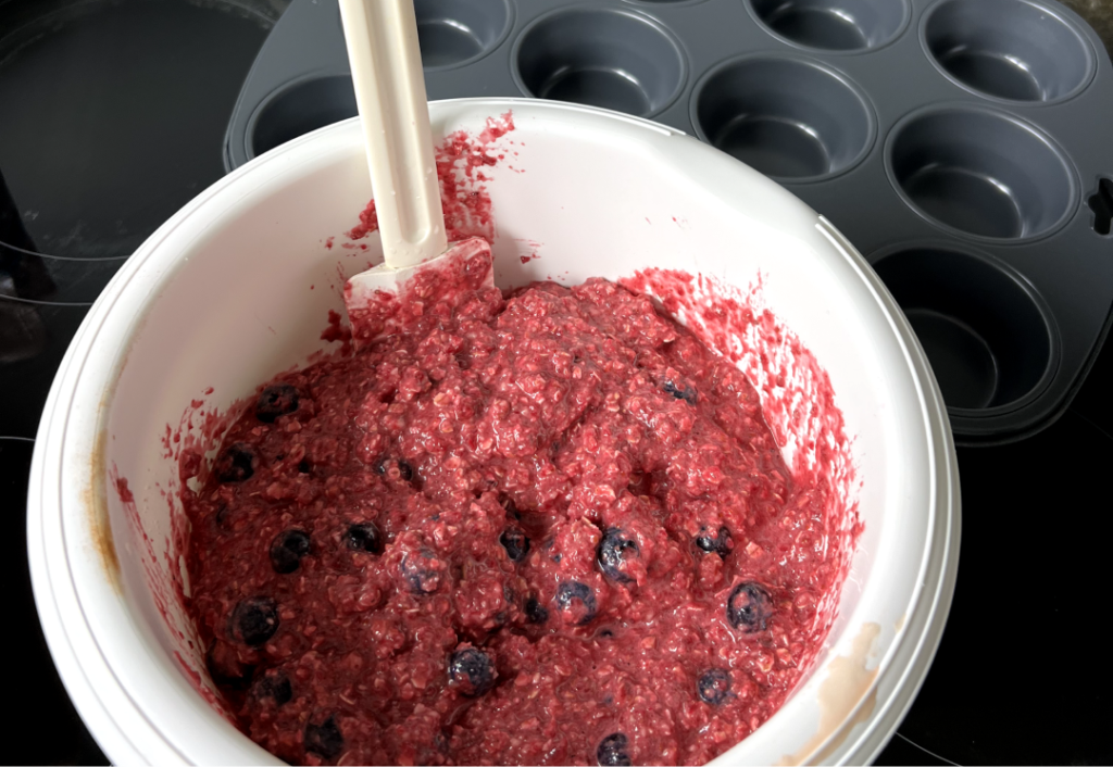 En dernier quand tout est déjà mélangé, ajouter les myrtille et remuer gentiment à la main afin de ne pas écraser les myrtilles.