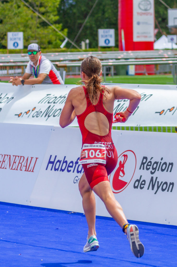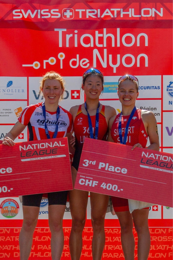 Sortant de l’eau dans le deuxième groupe, j’ai rapidement rattrapé le groupe de tête sur le vélo, prenant ainsi le lead à vélo. Après plusieurs attaques à vélo, je suis descendue du vélo en premier et j’ai entamé la course à pied en première position. Sur la course à pied, je me suis rapidement faite devancer par 3 des mes concurrente me laissant à la quatrième place. Je me suis battue jusqu’au bout et sur la fin du deuxième tour, j’ai devancé la 3ème et sprinté jusqu’a la ligne d’arrivée pour m’offrir la 3ème place. J’ai eu un grand plaisir à me battre contre mes coéquipières chinoises qui ont elles aussi participé à la course. Un beau moment partagé et une belle performance à la clé.