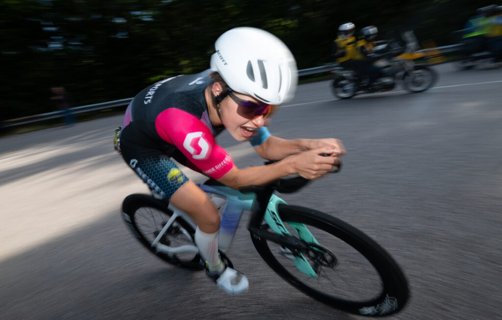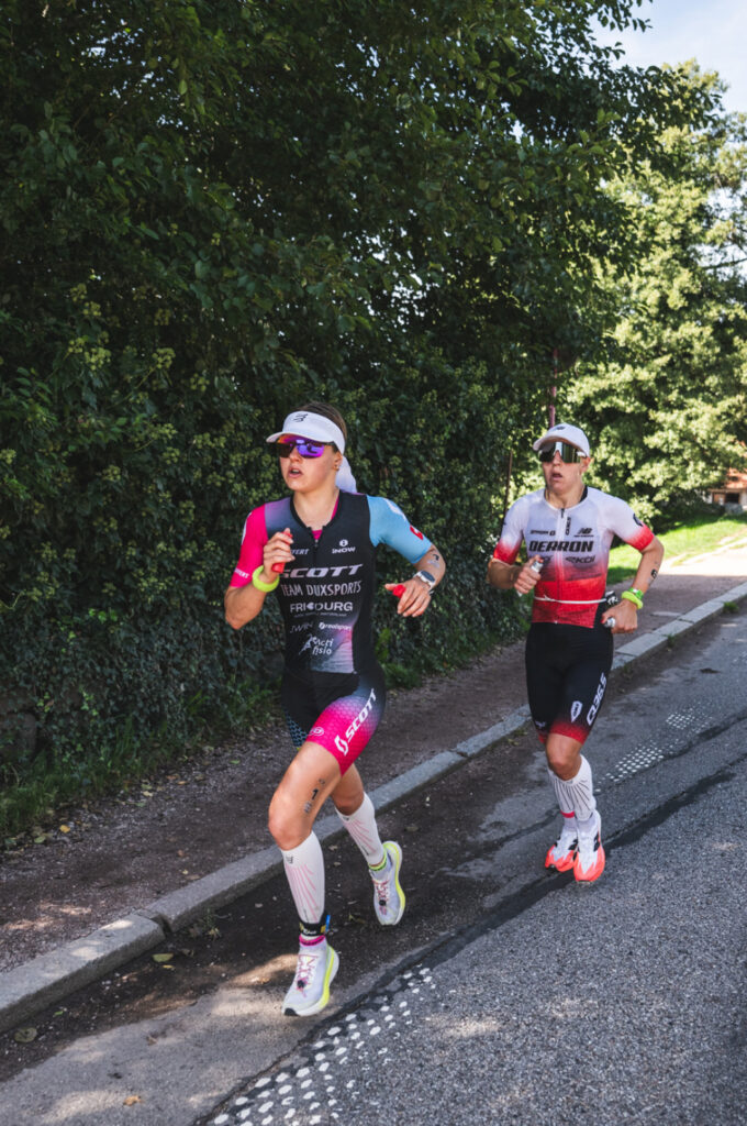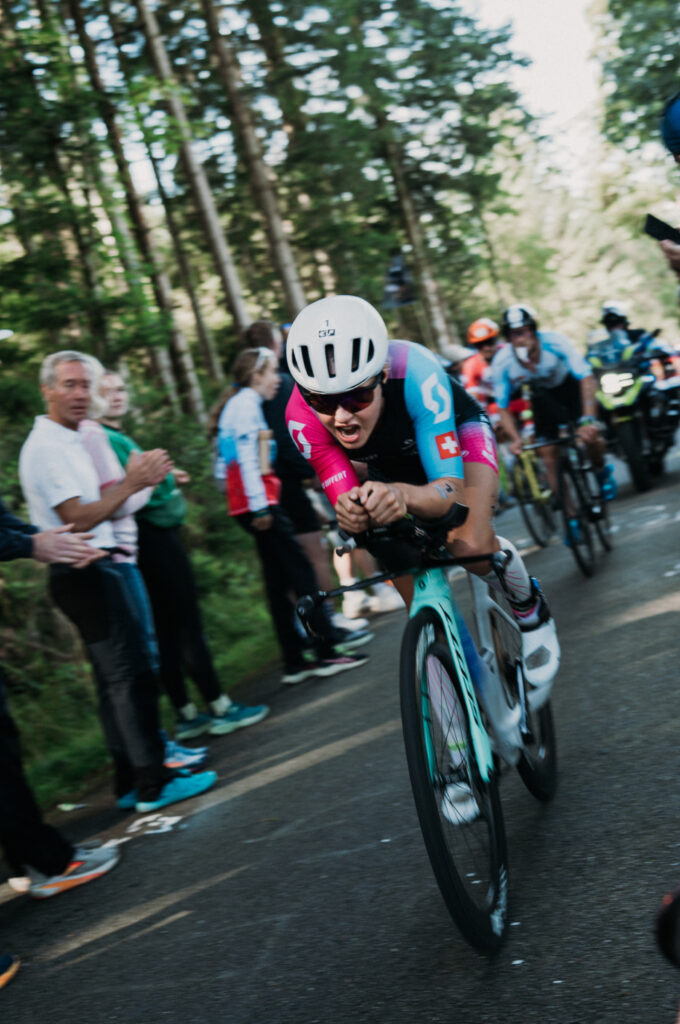 Dès la natation dans le lac, les sensations sont bonnes. Je prends rapidement les devants, tout en restant concentrée. La sortie de l’eau se fait en tête, mais je sais que la course est encore longue. Très vite, à vélo, ma coéquipière Nina Derron me rejoint. Commence alors un mano à mano intense, respectueux, exigeant. Pendant les 90 km, nous roulons « ensemble », sans jamais vraiment nous départager. Chaque montée, chaque relance compte et est intense.