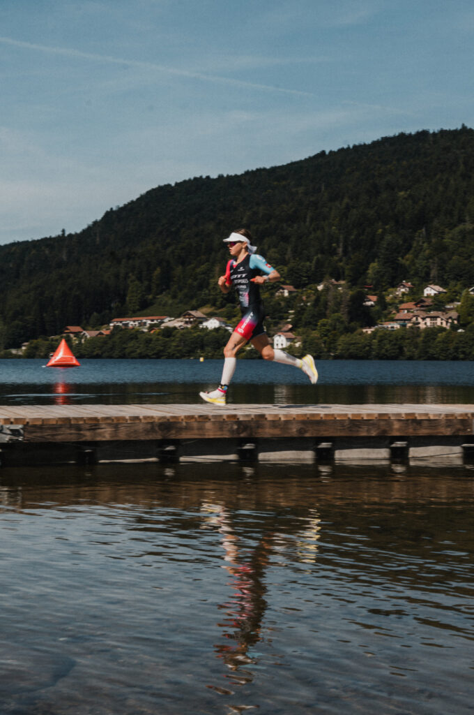 Sur la course à pied, le scénario reste le même. Nous sommes toujours côte à côte, prenant chacune notre tour le lead. Il faudra attendre le dernier tour. Sur une portion montante, je parviens enfin à creuser un petit écart, juste assez pour sécuriser mon avance avant la dernière boucle le long du lac.